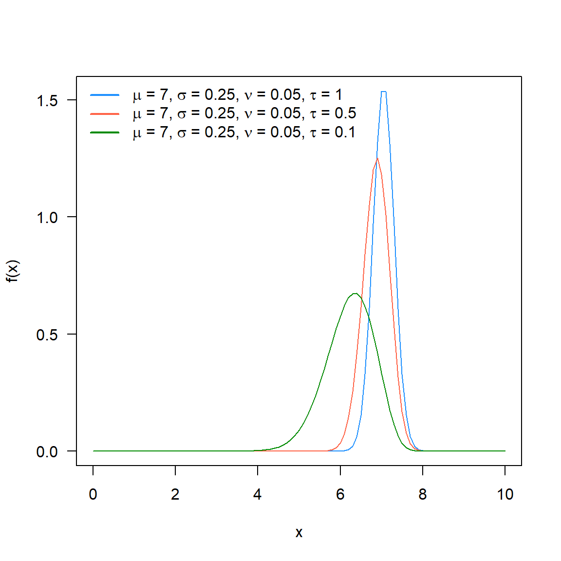 The Generalised exponential-Gaussian with parameters \(\mu, \sigma, \nu\) and \(\tau\) has density given by